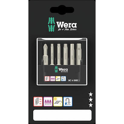 Wera 05135810001. Número de bits: 6 pieza(s), Desatornillador/puntas incluidas: Phillips, Brocas para destornillador Pozidriv: PZ 1, PZ 2