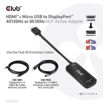 CLUB3D CAC-1335. Longitud de cable: 1 m, Conector 1: HDMI + USB, Conector 2: DisplayPort