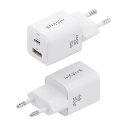 AISENS - CARGADOR GaN 30W, 1xUSB-C PD3.0 QC4.0, 1xUSB-A QC3.0, BLANCO<br>> P/N: ASCH-30W2P020-W<br>> EAN: 8435739900840<br><br>Descripción:<br>> Cargador GaN USB-C 30W para cargar portátiles, móviles, cámaras y tablets etc. Diseño muy elegante, moderno y práctico.<br>> Este cargardor cuenta con la tecnología GaN que ofrece una serie de ventajas, incluyendo una mayor eficiencia energética, menor generación de calor, mayor capacidad de corriente y menor tamaño y peso en comparación con los cargadores tradicionales de silicio. Estas ventajas hacen que los cargadores GaN sean una opción cada vez más popular para usuarios que buscan una carga más rápida, eficiente y sostenible.<br>> Tecnología AI (chip inteligente) incorporado que detecta el tipo de protocolo del dispositivo conectado para maximizar tanto la compatibilidad como la velocidad de carga.<br>> Cargue su dispositivo USB-C o USB-A de forma fácil y sencilla.<br>> Múltiples protecciones contra sobrecarga, cortocircuito, lo que garantiza la máxima seguridad para su dispositivo.<br>> Este cargador puede cargar simultáneamente 2 dispositivos USB-A y USB-C a máxima velocidad.<br><br>Especificaciones:<br>> Cantidad de puertos USB-C: 1<br>> Cantidad de puertos USB-A: 1<br>> Entrada: 100-240V 50-60Hz 1.2A<br>> Salida USB-C: 5.0V 3.0A; 9.0V 3.0A; 12.0V 2.5A; 15.0V 2.0A; 20.0V 1.5A (30W)<br>> PPS: 3.3V-11V 3.0A (33W)<br>> Salida USB-A: 5.0V 3.0A; 9.0V 2.0A; 12.0V 1.5A<br>> Salida USB-C+USB-A: 5.0V 3.0A<br>> Potencia total: 33W<br>> Nivel de eficiencia: VI<br>> Compatible con la mayoria de los dispositivos USB-C o USB-A tales como portátiles, teléfonos móviles, smartphones, tablets, GPS, MP3, MP4, consolas de videojuego etc.<br>> Soporta PD3.0 para poder cargar dispositivos inteligentes con tecnología PD3.0 de forma muy rápida.<br>> Aparte de soportar protocolo PD3.0, este cargador también soporta los siguientes protocolos:<br>> PPS: 3.3V-11V 3.0A<br>> QC3.0: 3.4V-12.03V<br>> QC2.0 / QC4.0: 5V, 9V, 12V, 20V<br>> HUAWEI FCP: 5V, 9V, 12V<br>> HUAWEI SCP: 3.3-12V<br>> SAMSUNG AFC: 9V, 12V<br>> APPLE: 5V 2.4A<br>> BC1.2: DCP 5V 1.5A<br>> Está fabricado con material ignífugo e incluye múltiples protecciones contra sobrecarga, cortocircuito, lo que garantiza la máxima seguridad para su dispositivo.<br>> Longitud: N/A<br>> Color: Blanco<br>> Normativas: RoHS, CE<br>> Test de funcionamiento: 100% testeado<br><br>Contenido del paquete:<br>> 1 x Cargador GaN 30W<br>> 1 x Manual de usuario multi-idioma