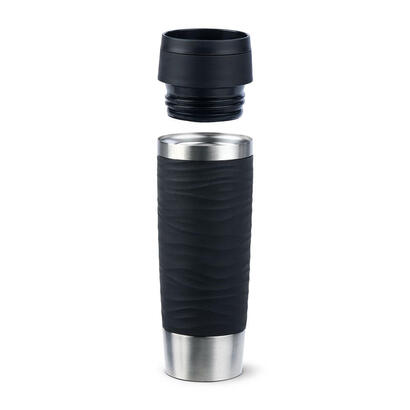 EMSA Travel Mug Waves Grande. Color del producto: Negro, Acero inoxidable, Material de la cubierta: Silicona, Acero inoxidable, Material de tapa: Polipropileno (PP). Volumen: 500 ml, Diámetro: 8,3 cm, Altura: 240 mm. Cantidad por paquete: 1 pieza(s)